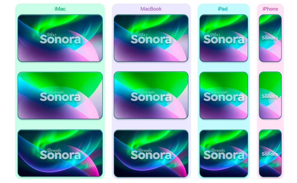 En comptant trois phases pour ce fond, et avec les déclinaisons disponibles, on atteint le nombre de 12 illustrations pour votre Mac, MacBook, iPhone et iPad.